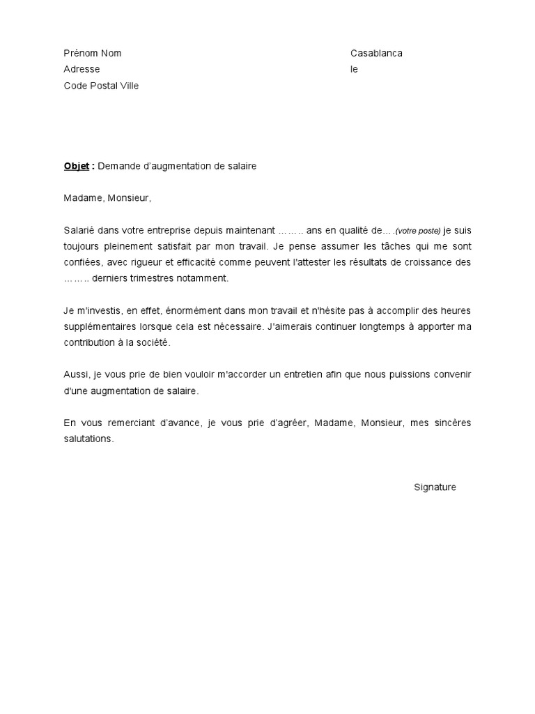 Une lettre de demande daugmentation de salaire invite lemployeur à sentretenir avec vous afin de convenir ensemble dune hausse de votre rémunération. En général votre premier interlocuteur est votre supérieur direct. Globalement on évite de. Une formation certifiante ou diplômante est souvent une bonne occasion de demander une.